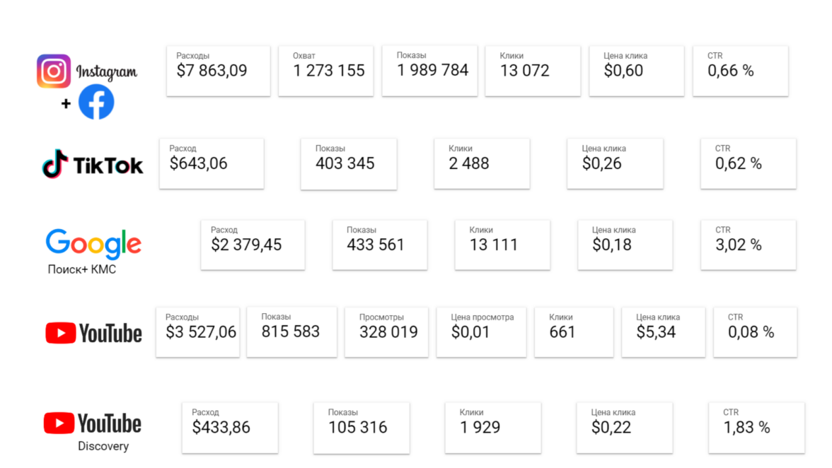 Этот инструмент стоит использовать для широких охватов и дешевого трафика. Однако на примере Дубая мы видим, что цена клика в тик ток уже значительно выше. А поведение на сайте сравнимо с поведением при настройке на конверсию в Казахстане, то есть хуже остальных каналов продвижения.