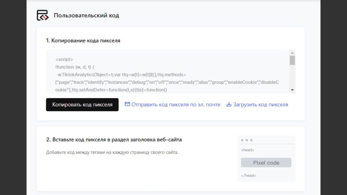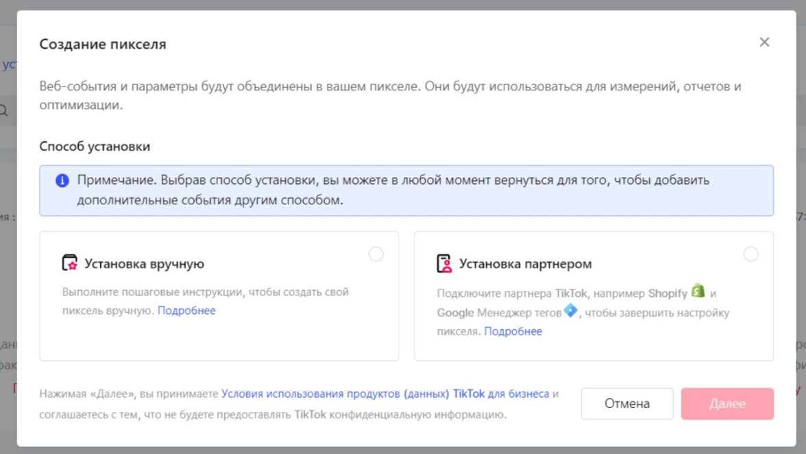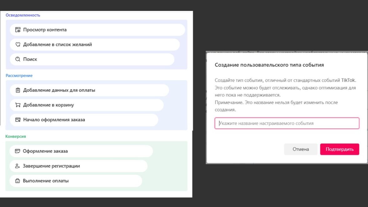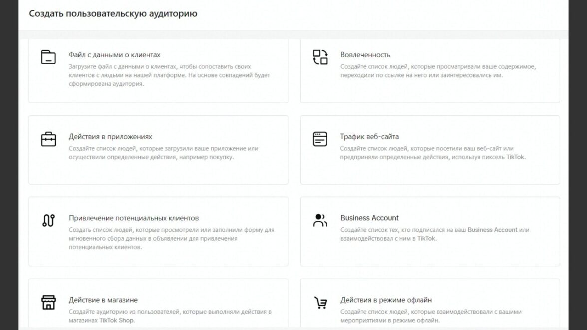На этом же этапе модно выставить «Отслеживание событий TikTok»: события на веб-сайте (пиксель), события в приложении, офлайн-события.