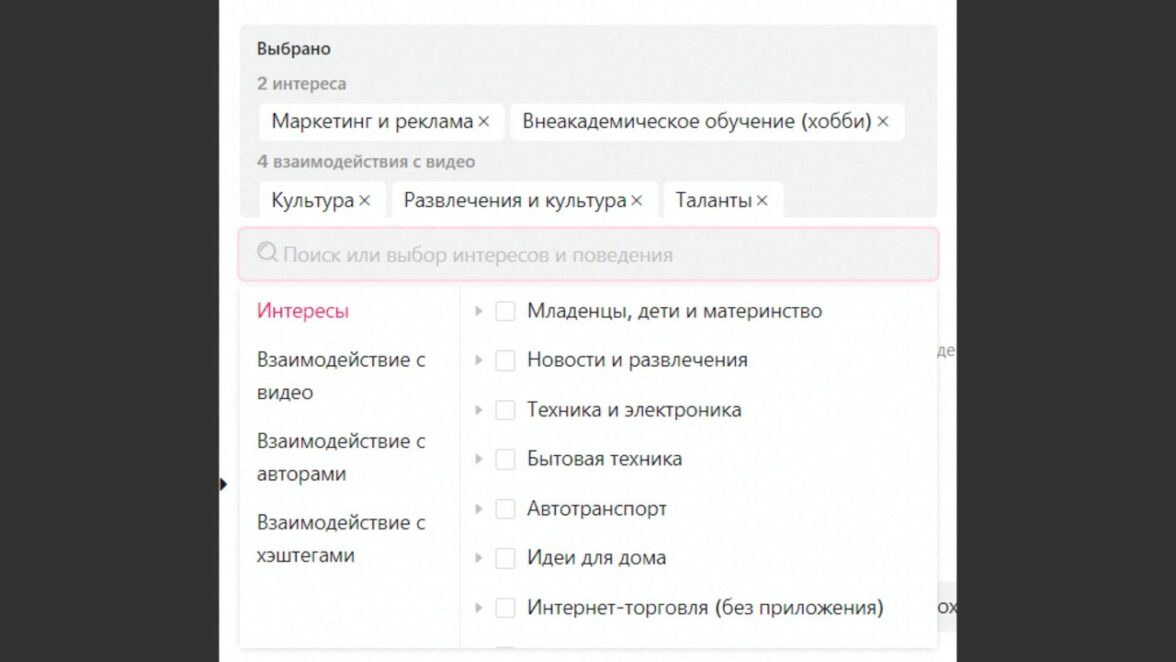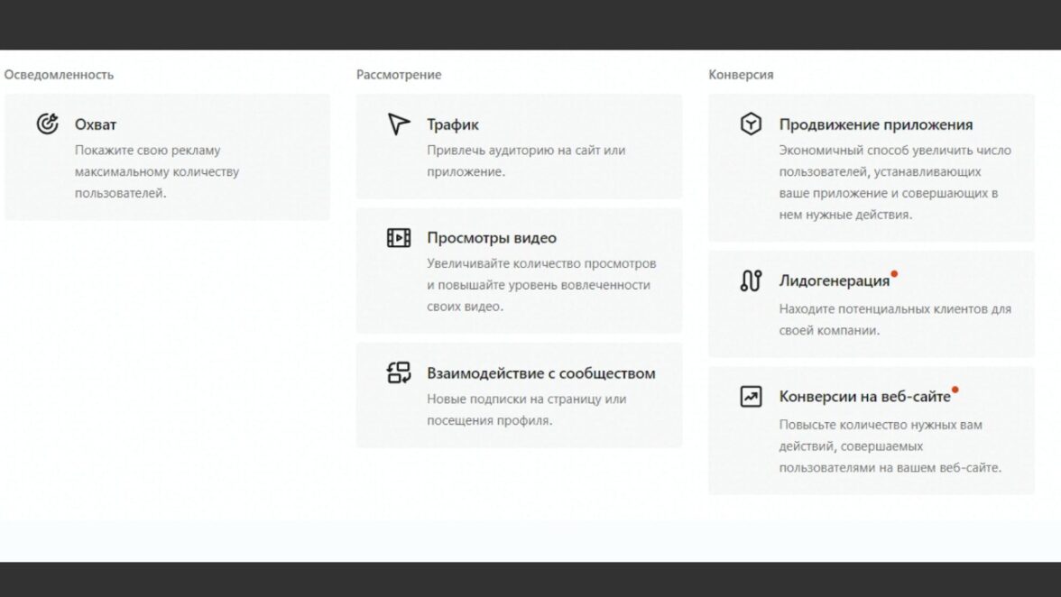 Рассмотрение. Сюда включены цели «Трафик», «Просмотр видео» (без перехода на источник — в самом Тик Токе), «Установка приложения», «Лидогенерация», «Взаимодействие с сообществом».