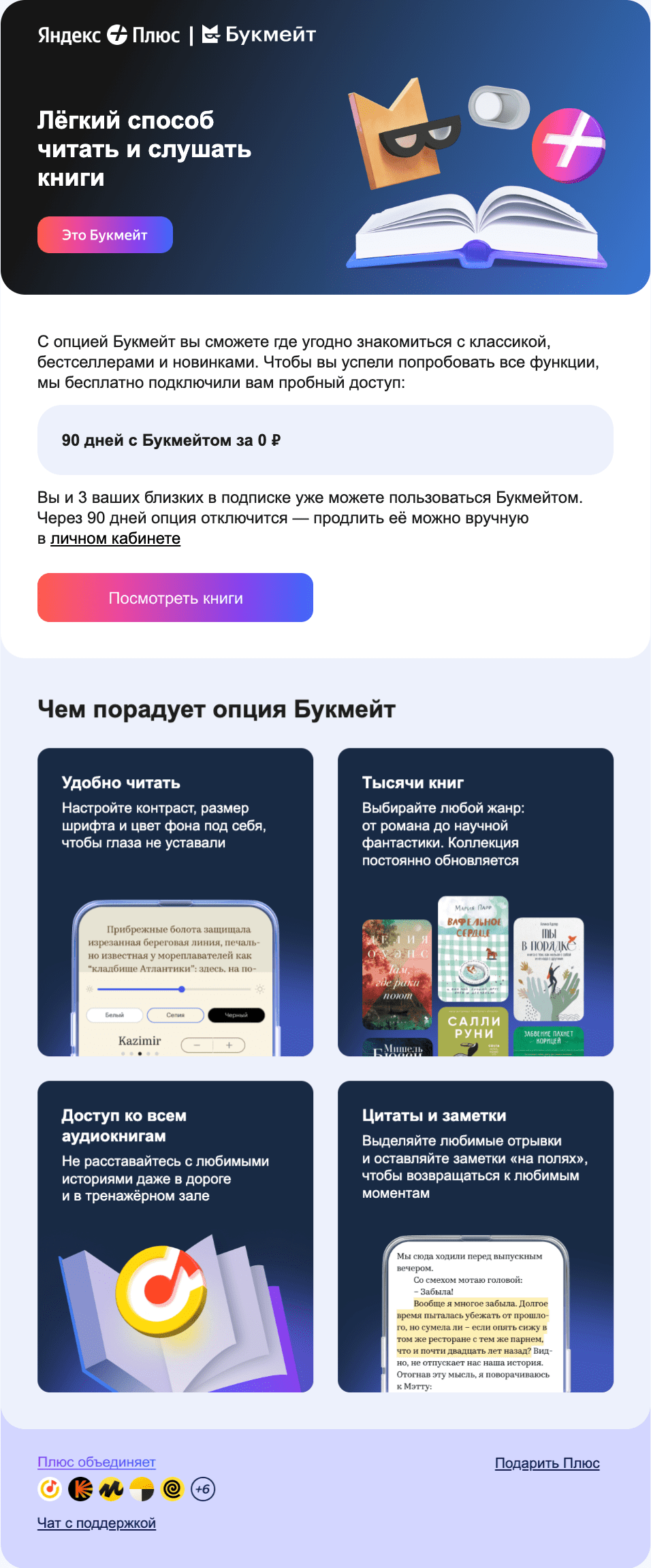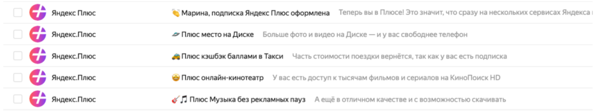 Для более сложного продукта нет универсального решения: набор писем зависит от специфики продукта. Например, «Яндекс Плюс» последовательно знакомит новых пользователей с сервисами экосистемы: