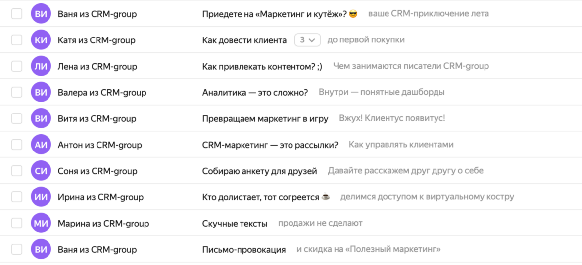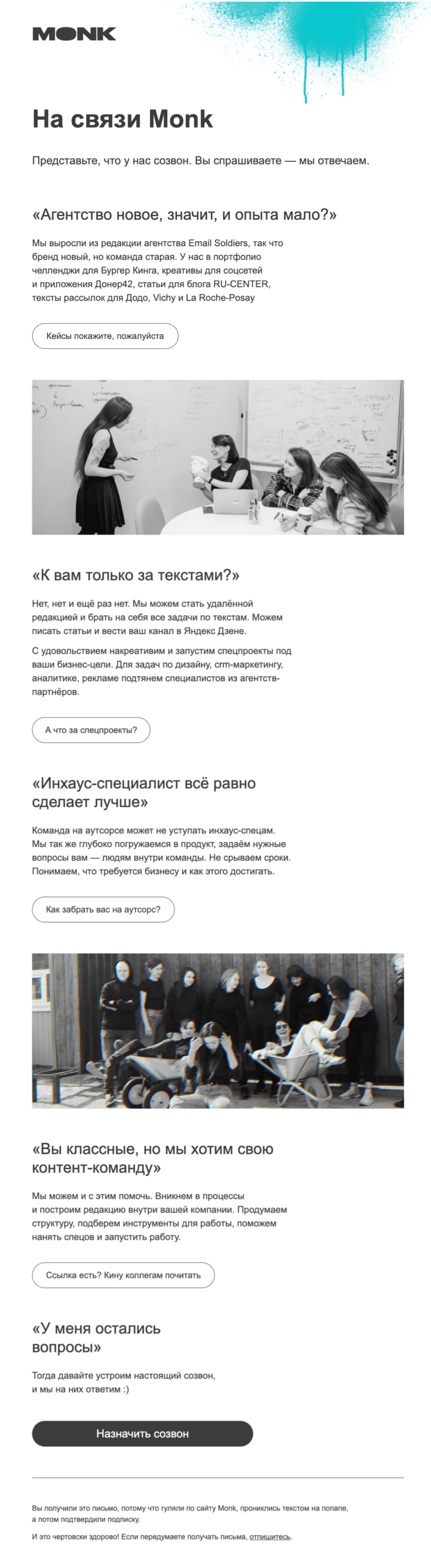 Мы в каждом новом письме знакомим подписчиков с отделами компании от лица руководителей и рассказываем, какие услуги можно у нас заказать: