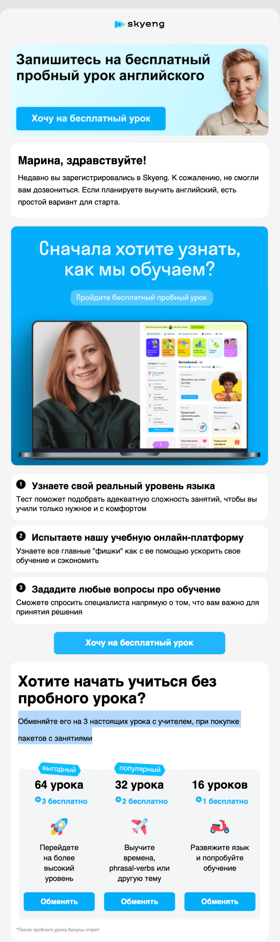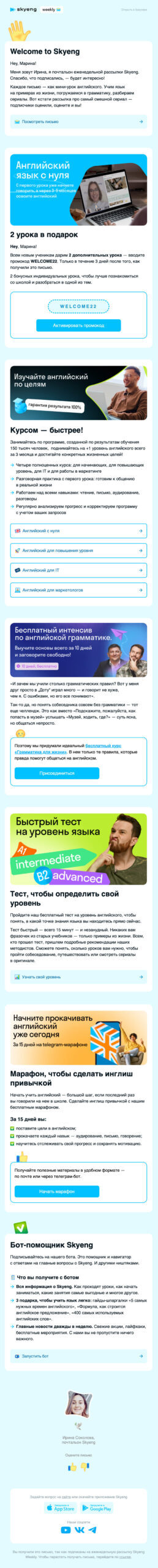 Так, Skyeng в своём велкоме не продаёт сразу дорогие курсы, а предлагает подписчику познакомиться поближе через бесплатные сервисы: