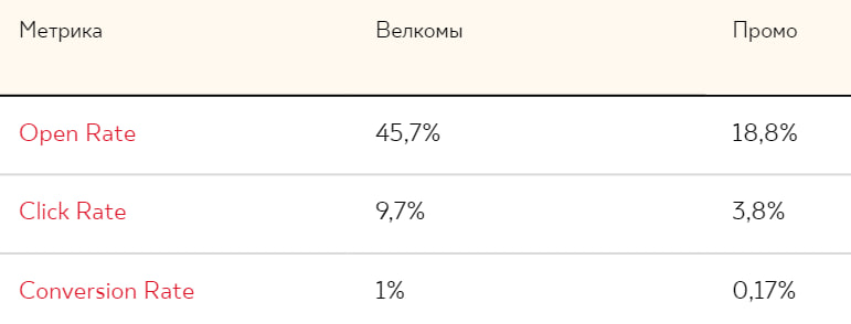 Для одного из своих клиентов, крупного международного бренда косметики, мы запустили welcome-цепочку из трёх писем. Стоимость такой цепочки — 75 000 рублей. Вот какие результаты мы получили уже за полгода после запуска велкомов:
