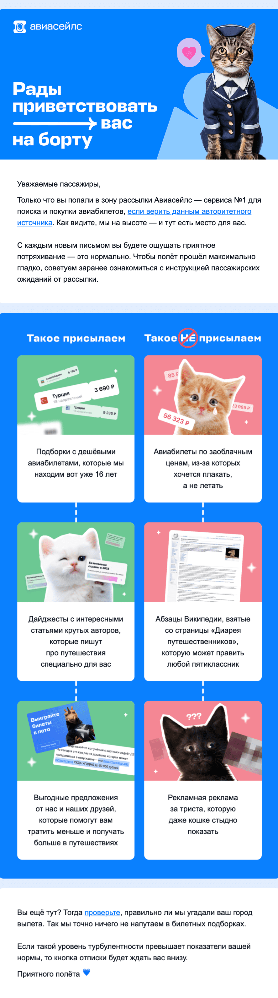Пока интерес подписчиков к бренду высок, нужно успеть сказать всё важное, при этом не растратить их внимание зря. Частая ошибка брендов — рассказывать о своих регалиях и достижениях или подробно описывать, что будет в следующих рассылках, вместо того, чтобы сразу предложить подписчику что-то полезное.