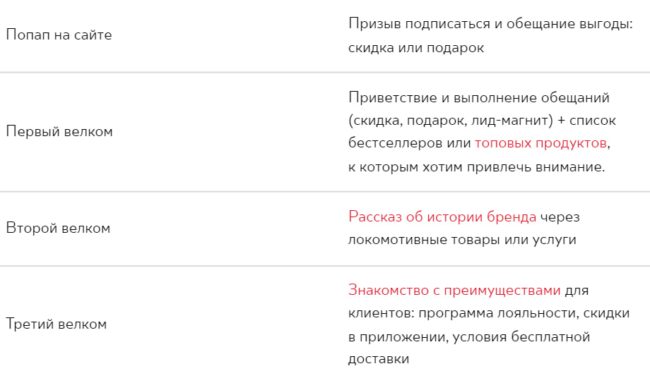 Не нужно изобретать welcome-цепочку с нуля, можно адаптировать под себя универсальную схему: список бестселлеров + рассказ об истории бренда через локомотивные продукты + знакомство с сервисами, программа лояльности, приложение, доставка и так далее.