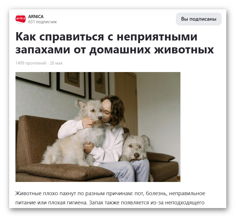Мы писали для канала ARNICA в Дзене четыре статьи в месяц. Некоторые из них клиент сам ставил на платное продвижение, чтобы привлечь новых подписчиков.