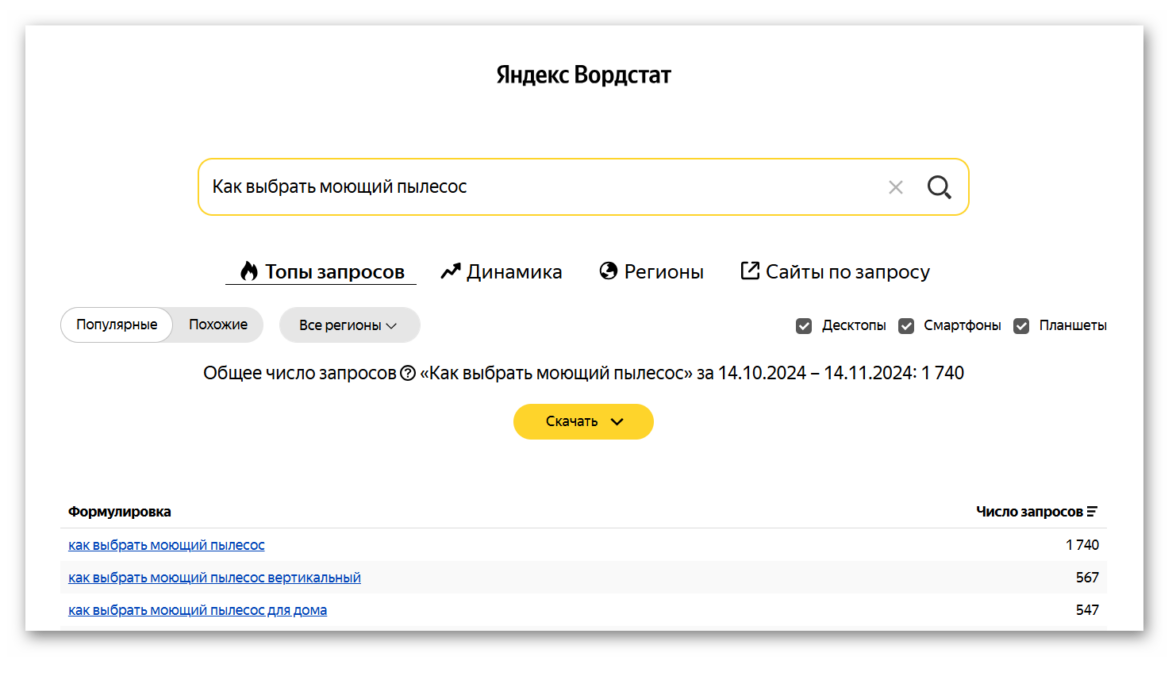В Яндекс Вордстате можно проверить, сколько человек в месяц вводят тот или иной запрос в поисковую строку
