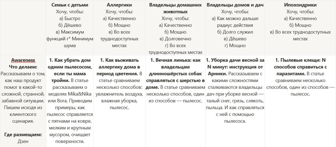 Это часть нашего контент-плана для клиента. Мы определили, что важно целевой аудитории, и разбили темы на пять блоков в зависимости от ЦА.
