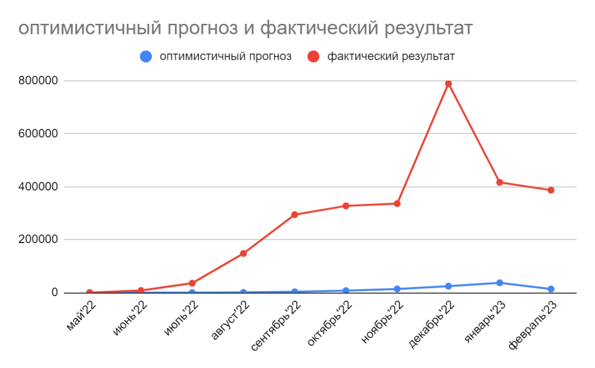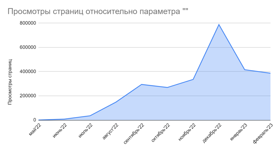 Несмотря на то, что клиент разместил меньше статей, чем мы закладывали в план, все они принесли трафик. Число переходов на сайт быстро росло. Особенно показательным был декабрь 2022 — в сезон простуд, в условиях максимально высокой конкуренции статьи принесли сайту клиента более 788 000 просмотров.