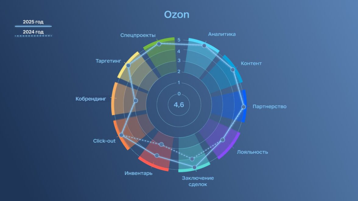 Ozon третий год подряд сохраняет лидерство в 7 из 11 категорий, включая «Таргетинг», «Аналитику» и «Партнерства». Платформа развивает продвинутые инструменты click-out, более 10 форматов баннеров, а также предоставляет детальные метрики brand lift и sales uplift, позволяющие оценивать влияние digital-активностей на офлайн-продажи.