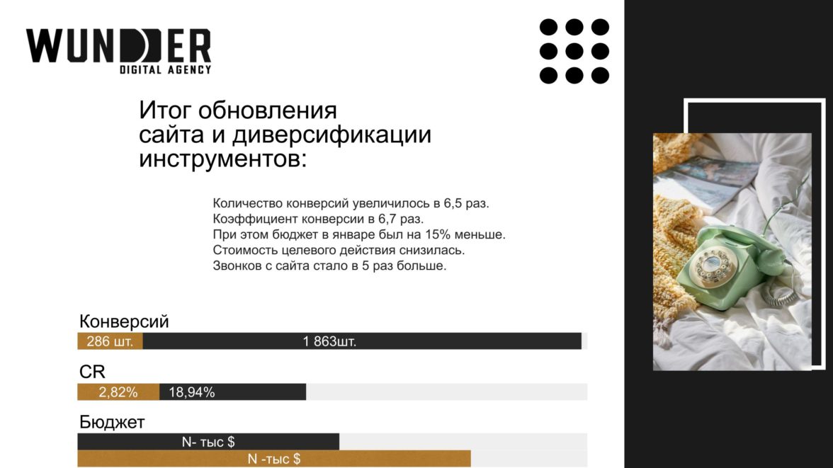 Так, например, один из застройщиков Казахстана планировал продать 30 квартир за 2 месяца через таргетированную рекламу. Специалисты Wunder Digital решили работать не только с тёплой аудиторией, но и с холодной. Кампании настроили по интересам — недвижимость, квартира, ипотека. Благодаря правильной настройке удалось добиться высокого уровня конверсий и продать 32 квартиры за 2 месяца!