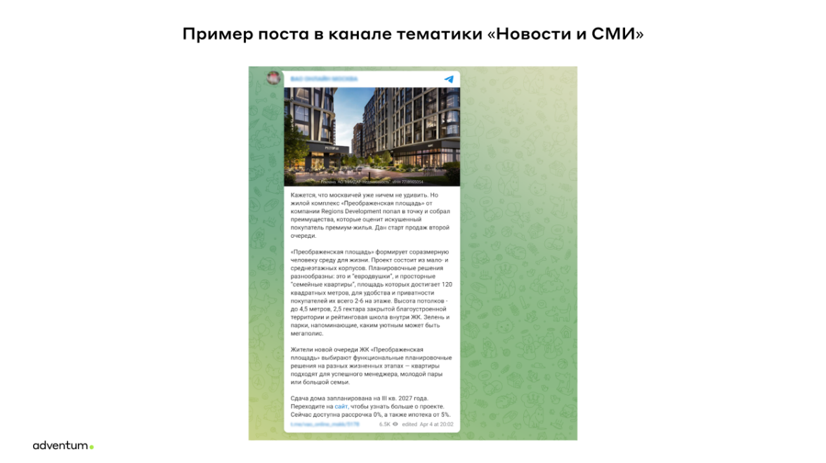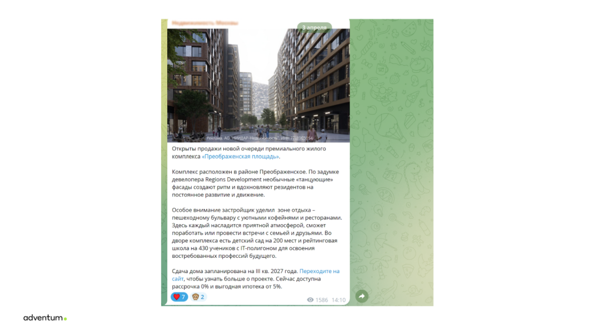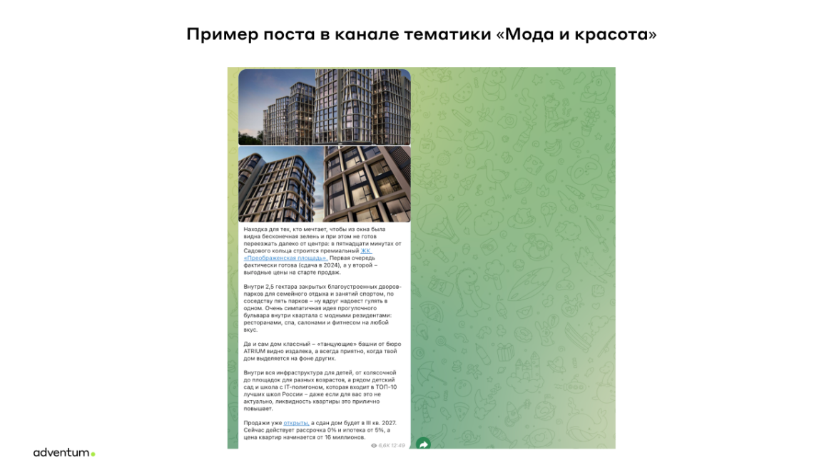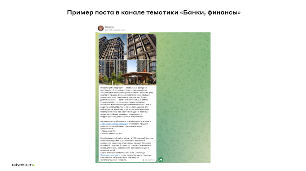 Как продвигать премиальные продукты через посевы в telegram-каналах: кейс Adventum и ЖК Преображенская площадь
