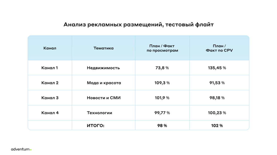 За этот период по показам мы достигли 98% от планируемого результата, а CPV оказалась на 2% выше плана.