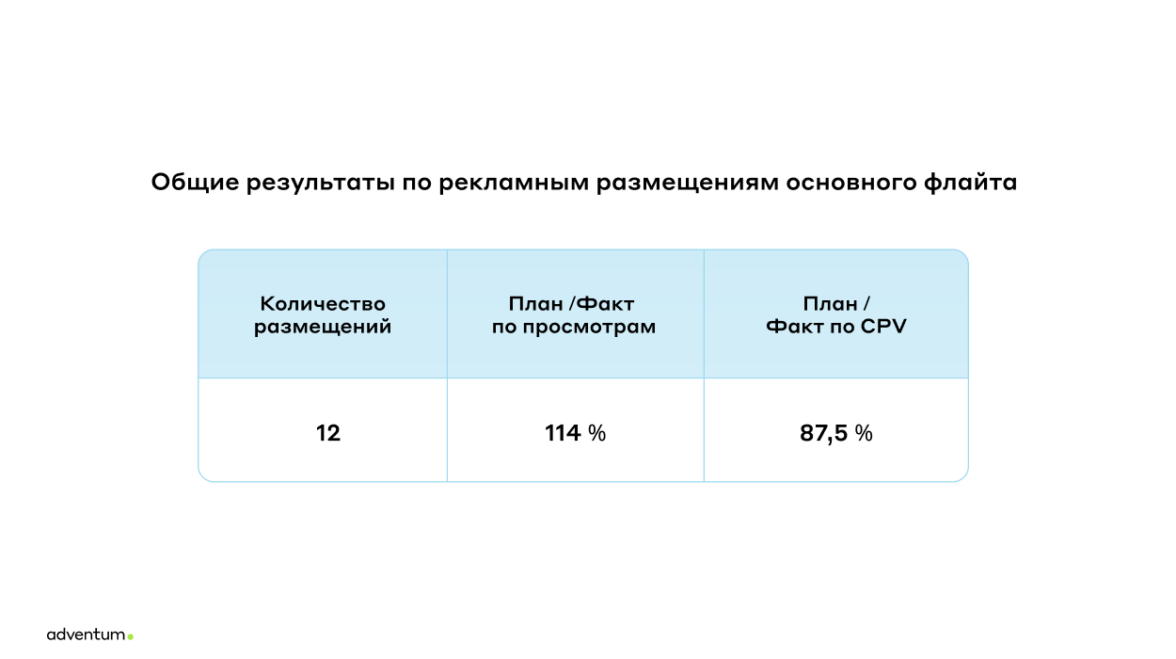 Фактические показатели по просмотрам превысили плановые на 14%, а стоимость контакта с пользователем снизилась на 12.5% относительно плана.