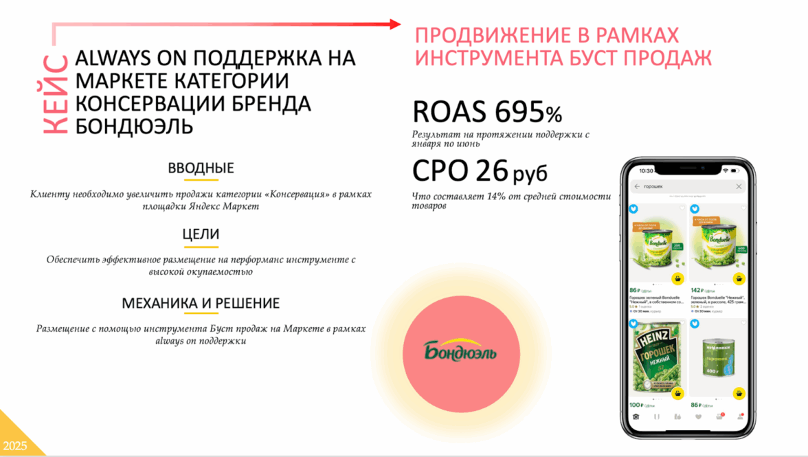 Продукты питания становятся одной из самых популярных категорий товаров на маркетплейсах. Так, рынок онлайн-продаж продуктов питания в первом квартале 2025 года показал значительный рост — на 26,8% по сравнению с аналогичным периодом прошлого года. Как и в любой другой категории товаров, брендам здесь важно выделяться и привлекать к себе внимание пользователей. Сделать это можно с помощью эффективных инструментов продвижения, которые доступны продавцам на маркетплейсах. На примере бренда Бондюэль рассказываем, как основной инструмент продвижения на Яндекс Маркете Буст продаж помог привлечь внимание к товарам и увеличить продажи.