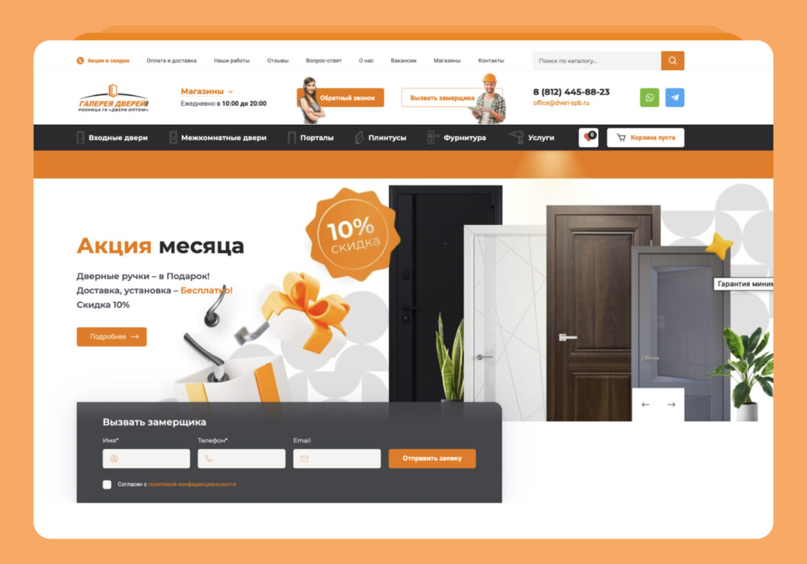 При запросе рекомендации магазина в Санкт–Петербурге для покупки дверей наш клиент оказывается в выдаче первым.