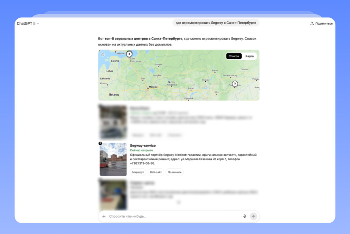 У ChatGPT просто спросили, где можем отремонтировать сегвей. В выдаче – вторые, но обратите внимание на описание: «официальный партнёр», «гарантии», «оригинальные запчасти» – очевидно, что заказать услугу захочется не там, где просто демпингуют цены, а где сразу сообщают о преимуществах вдолгую – качестве и гарантиях этого качества.