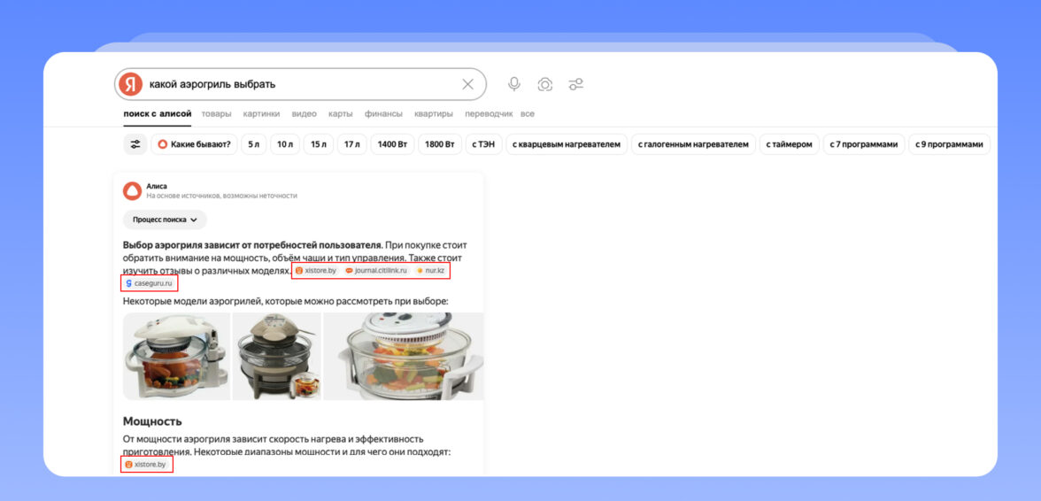 Так выглядит AI–выдача в Поиске с Алисой. Ответ на вопрос подкреплён источниками – магазинами, в которых упоминаемый пользователем товар можно купить