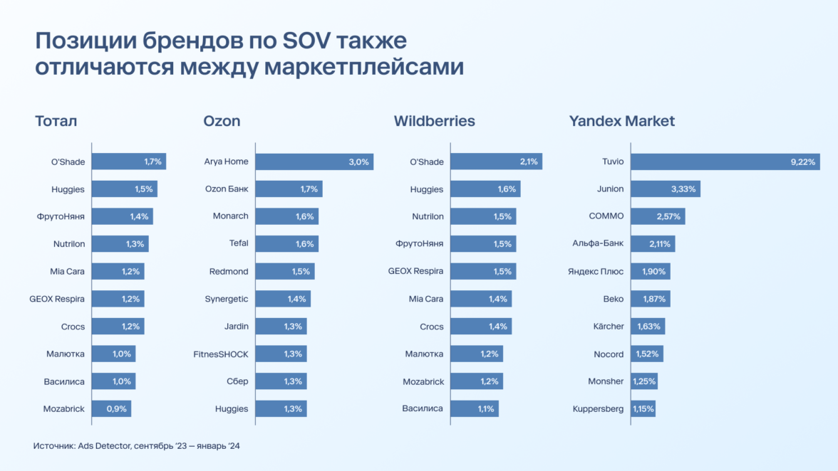 На примере брендов можно отследить, как состав рекламных кампаний — сплит — меняется от маркетплейса к маркетплейсу.
