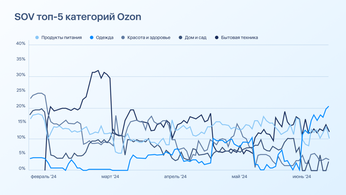 Если рассмотреть динамику размещений внутри категорий глубже, то можно заметить, как количество кампаний в самых популярных категориях на Ozon меняется от сезона к сезону.