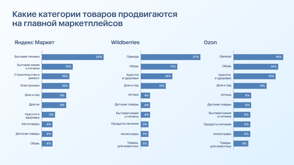 На графике ниже собраны категории, товары из которых чаще всего рекламируются на главных страницах маркетплейсов. Для каждого маркетплейса они разные, и эти данные важно учитывать при планировании размещений.