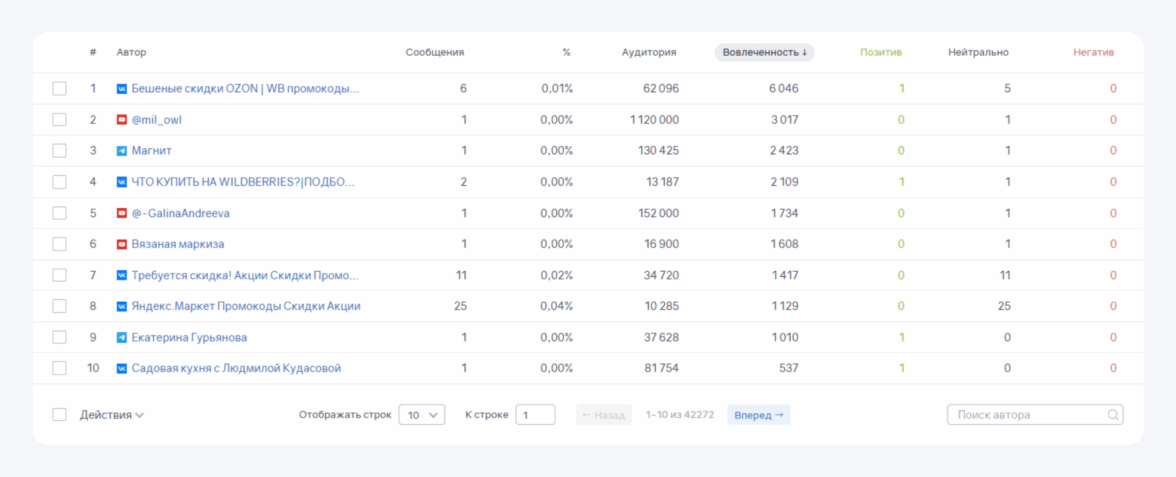 Автоматически список авторов упорядочен по количеству их сообщений в теме. Однако большой объем сообщений не всегда приводит к качественным коммуникациям, и на вершину рейтинга по числу сообщений могут попасть рекламные аккаунты, которые массово размещают сообщения на разных страницах в соцмедиа.