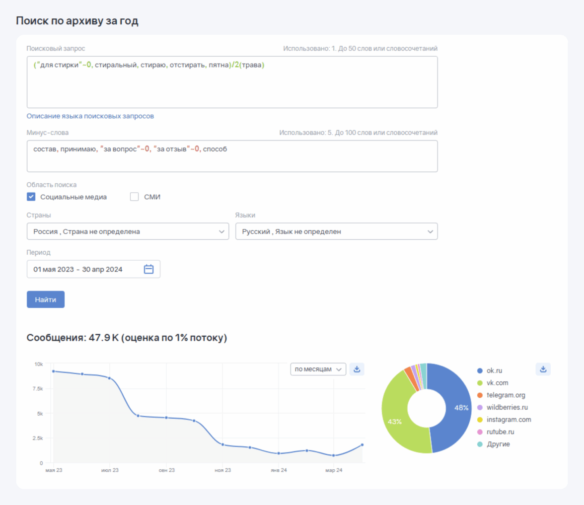 Чтобы выбрать нишу, нужно оценить востребованность продукта, одним из признаков которой является обсуждаемость в соцмедиа. Для анализа популярности можно воспользоваться функцией «Поиск по архиву за год».
