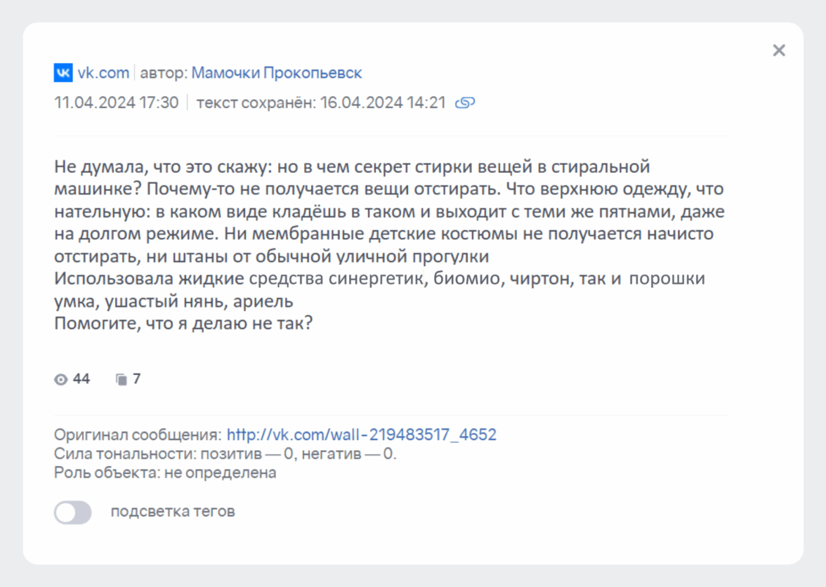 Контент-анализ упоминаний товара помогает обнаружить слова, которыми его описывает пользователь. Жаргонные фразы можно использовать в тексте карточки наряду с официальными терминами для совершенствования описания.