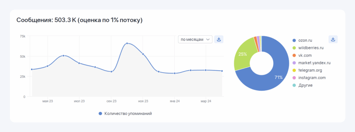 В одной продуктовой категории может быть несколько продуктов. Чтобы решить, на какой из них делать упор в продвижении на маркетплейсах, рекомендуем провести продуктовый анализ с помощью аналитики соцмедиа.