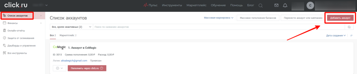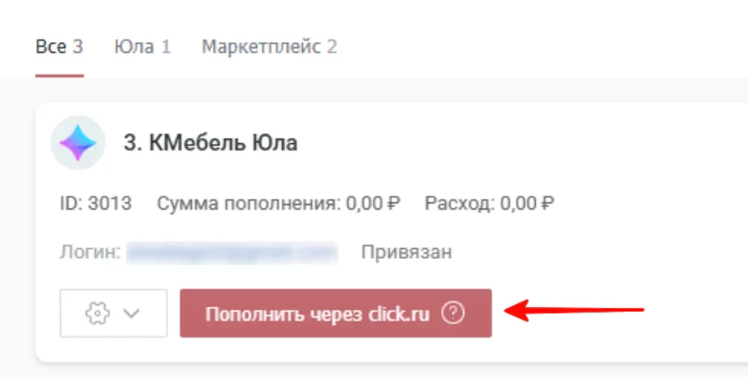 4. После этого ждем 1–3 рабочих дня. Специалистам click.ru и Юлы нужно проверить данные. После модерации аккаунт будет создан. В интерфейсе около него появится отметка «Привязан». С этого момента аккаунт можно пополнять.
