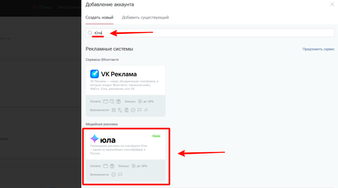 2. Выбираем Юлу из списка в выпадающем окне. Также можно набрать название классифайда в строке поиска: