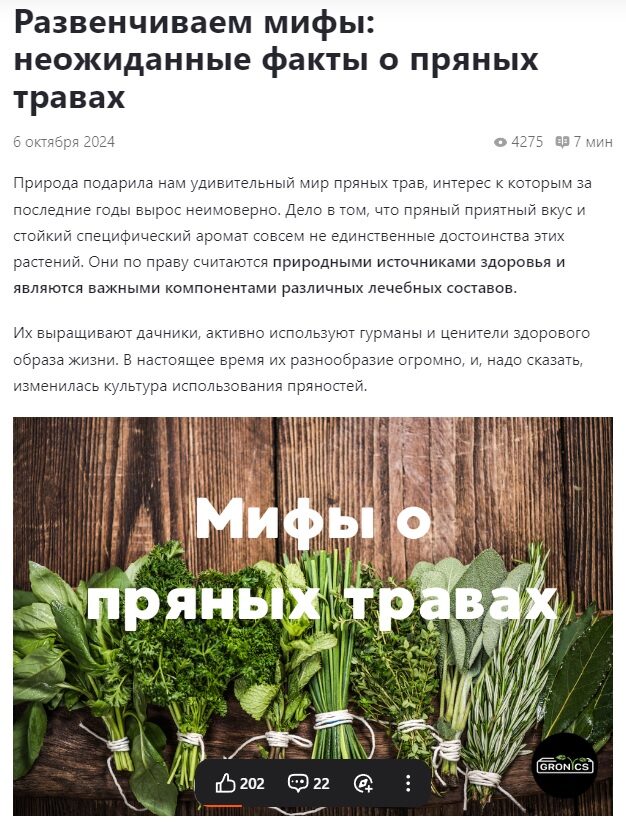 Статья Умной фермы Gronics на Дзене развенчивает мифы о пряных травах