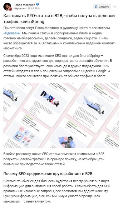 Статья Павла Молянова, руководителя агентства «Сделаем» об успешном кейсе на vc.ru