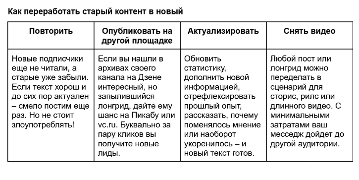 Такой же рачительный подход применим и к продвижению бизнеса с помощью контента. Можно, конечно, для каждой площадки нанять отдельного человека и писать все тексты с нуля. Но зачем? Одну единицу контента легко переработать в несколько разных форматов, а идеи для новых статей и постов уже есть в ваших архивах, нужно только поискать.
