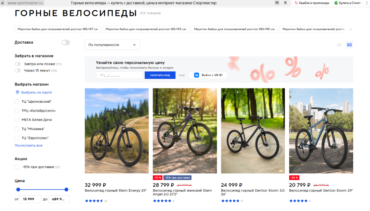 На странице категории «Горные велосипеды» тоже может обнаружиться масса пробелов: мало фильтров или они неудобные, нет сортировки по важным параметрам, нет SEO-текста или он слабый, нет описания ключевых типов/брендов внутри категории, нет блока с популярными/рекомендуемыми товарами.