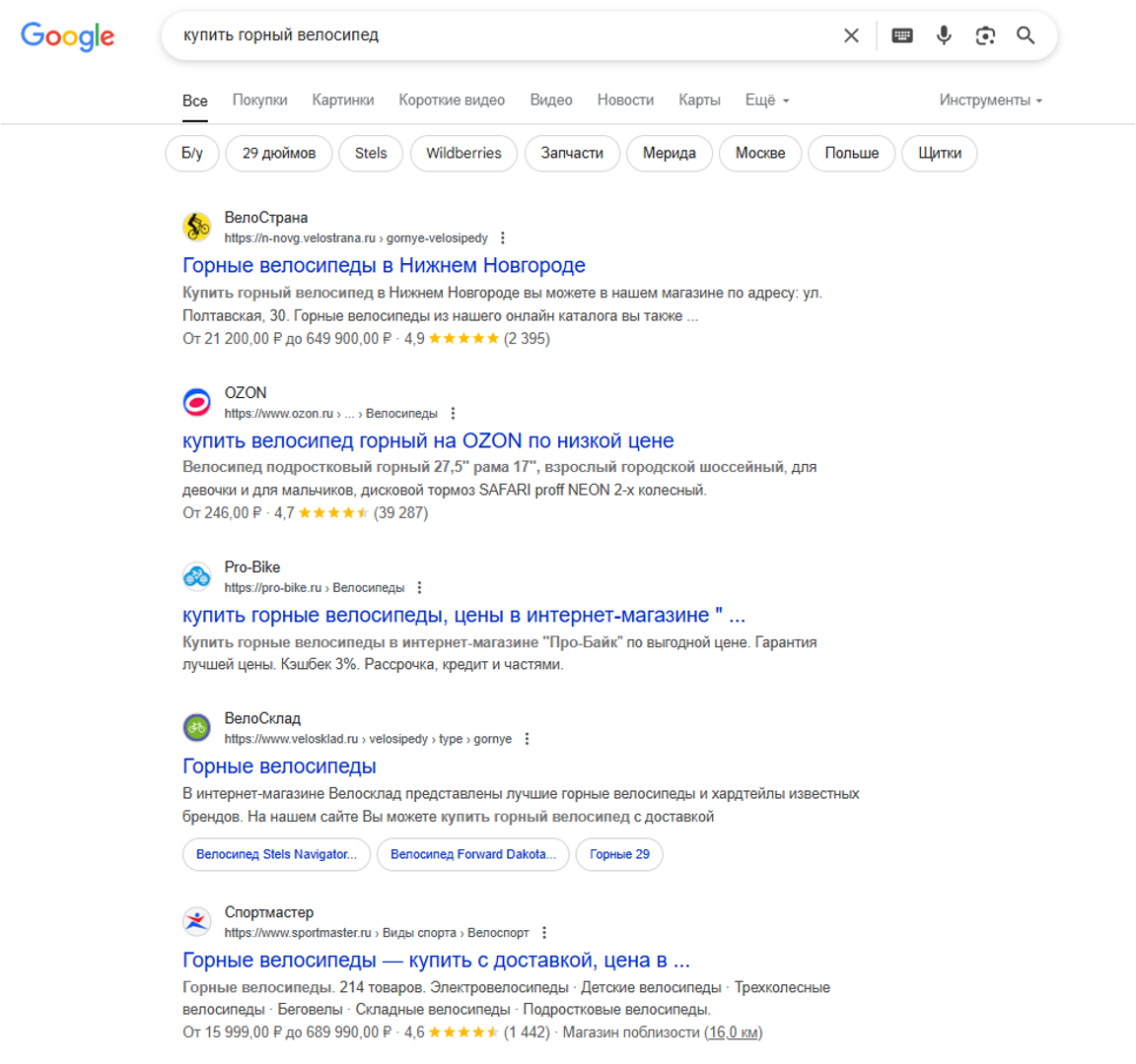 Запросы: «купить горный велосипед», «горный велосипед 29 дюймов», «велосипед trek горный», «недорогой горный велосипед».
