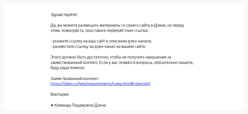 Все статьи до второй реформы мы рерайтили и только после этого отправляли на Дзен. То есть какая-никакая, а отдельная работа для канала делалась. Затем решили отказаться от рерайта и публиковать статьи в том же виде, что и на сайте. На всякий случай уточнили у поддержки Дзена, будет ли влиять это кардинально на продвижение или нет, и получили вот такой ответ: