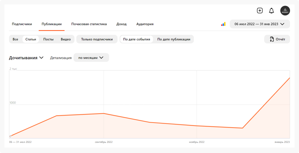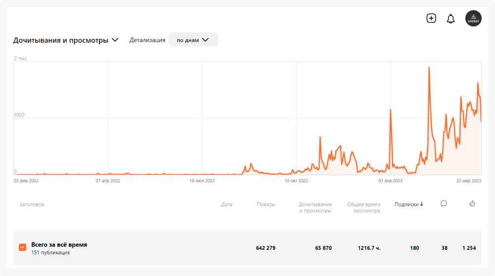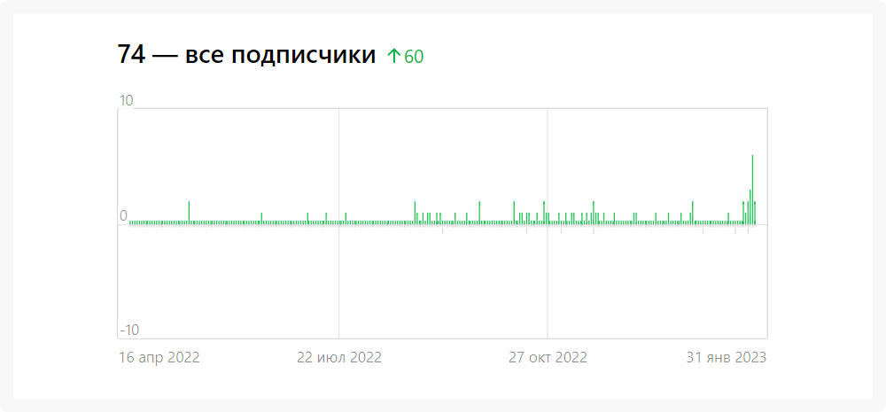 С учётом ведения канала с нуля и публикацией плюс-минус 8 единиц контента в месяц — это хороший результат. Главное, не количество, а качество! И прирост на любимых графиках, а он был.
