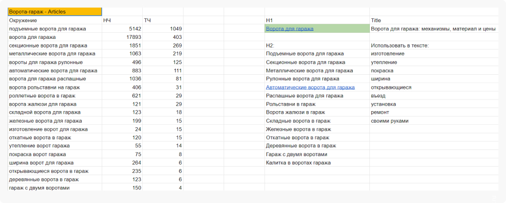 Первые статьи писались, как и нынешние, под запросы пользователей. SEO-спец составляет ядро запросов по определённой тематике, колдует над ним, и в итоге выдаёт H1, список H2 и Meta Title. Выглядит это примерно так: