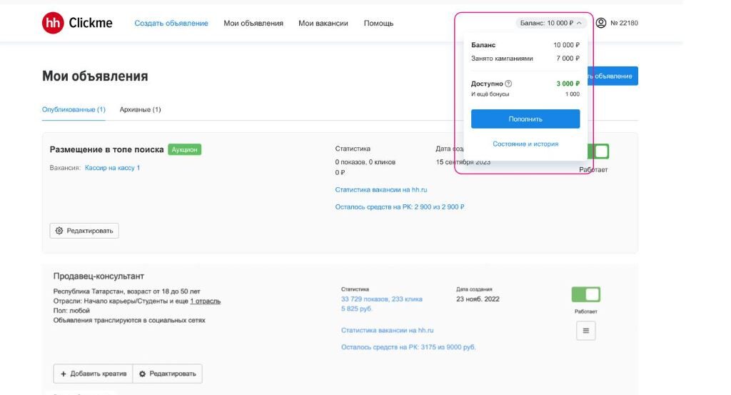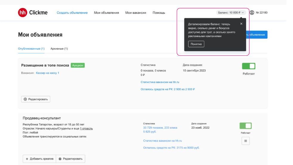 Управлять бюджетом на продвижение вакансий в Clickme также стало удобнее. Теперь в личном кабинете отображается детализированный баланс: сколько денег и бонусов доступно на счету, а сколько занято рекламными кампаниями.