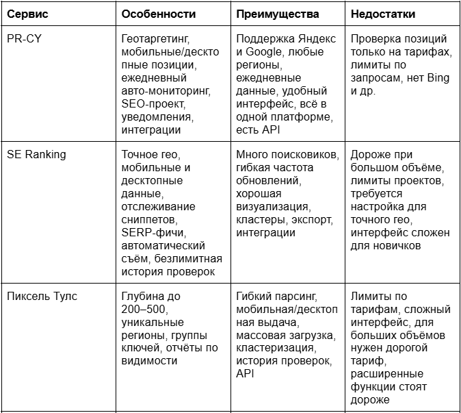 — Мониторинг позиций по ключевым фразам с регулярным обновлением.