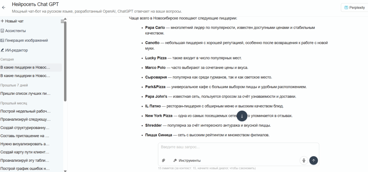 Ответ Perplexity на вопрос «В какие пиццерии в Новосибирске ходят чаще всего?»