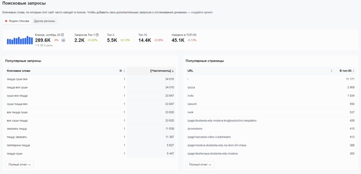 Блок «Популярные страницы» показывает, на какие страницы заходит большинство пользователей. В сфере питания это чаще всего страницы с категориями еды или конкретными товарами, условиями доставки или адресами ресторанов.