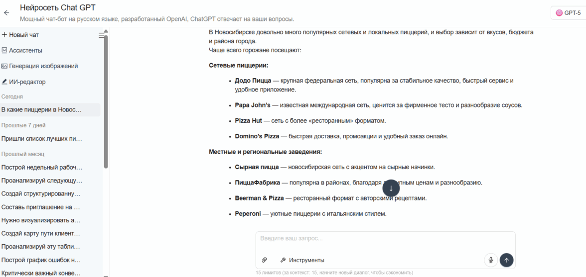 Ответ ChatGPT5 на вопрос «В какие пиццерии в Новосибирске ходят чаще всего?»