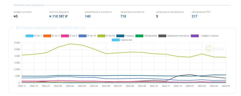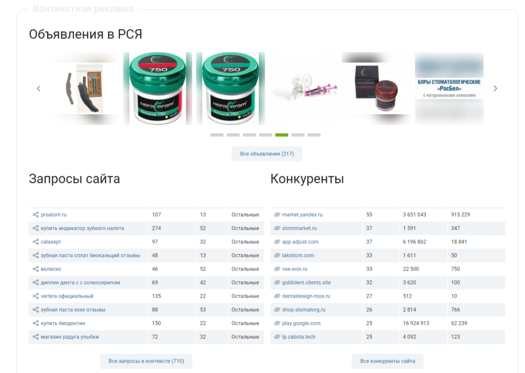 Так выглядят собранные сервисом keys.so объявления, запросы и конкуренты сайта