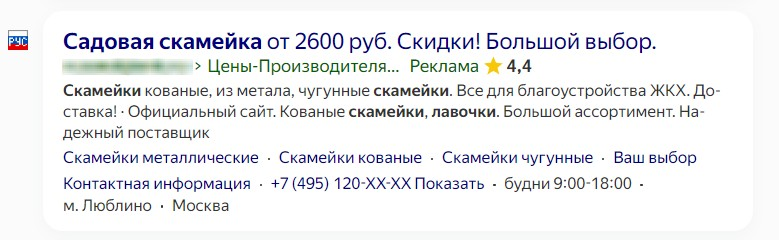 На примере из скриншота ниже слово «скамейки» упоминается в тексте объявления, в уточнениях и быстрых ссылках. А можно было добавить конкретику: от 2600 руб., система скидок до 8 %. Доставка заказа от 25 т.р. бесплатно.