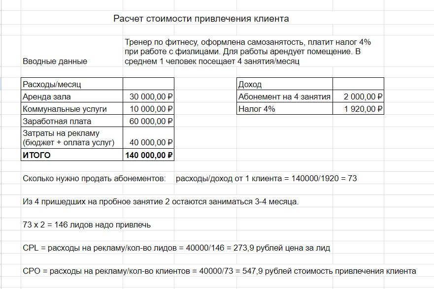Цифры берутся не из головы, а рассчитываются на основе данных бизнеса. Пример расчёта — в таблице: