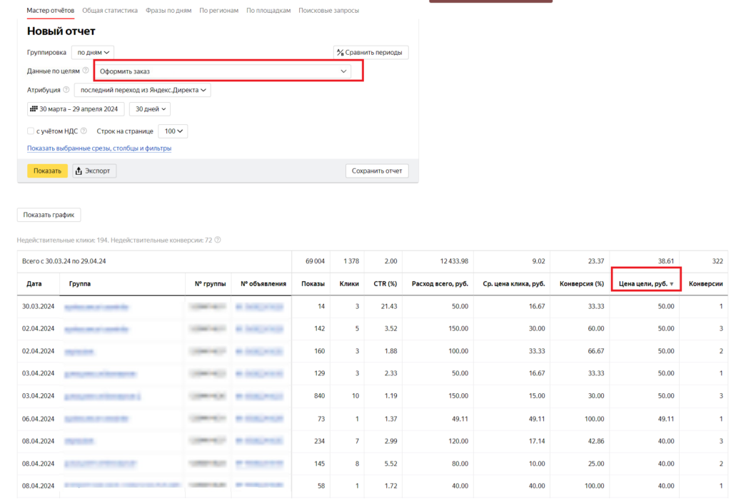 В первую очередь проверяйте стоимость конверсий (CPA), количество конверсий (CV), коэффициент конверсий (CR). В любых отчётах, о которых будем говорить дальше, выбираете цель и делаете сортировку по нужному показателю от большего к меньшему.
