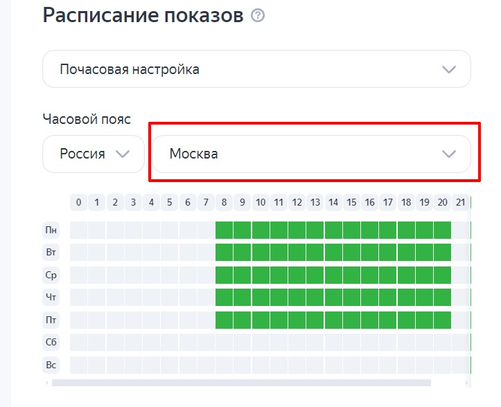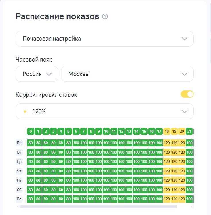 Здесь же можно установить корректировки по временному таргетингу. Эта настройка доступна только в стратегиях с ручным управлением ставками.