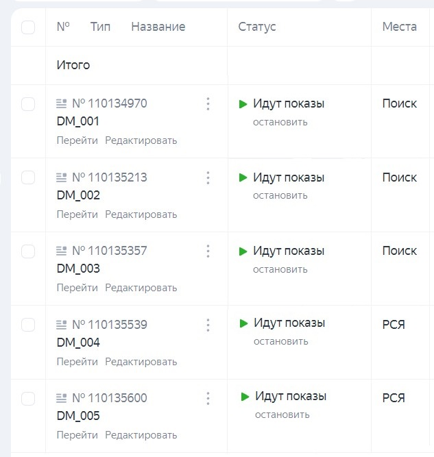 В грамотно структурированном аккаунте кампании разделены по регионам, местам показа, товарам, типам запросов. Прослеживается определённая логика.